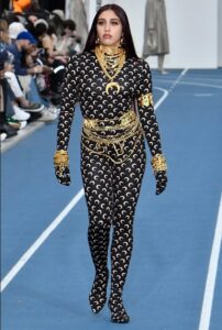La “Lurdes”, actualmente de 25 años, apareció vistiendo un traje estilo catsuit o body, ajustado a todo su cuerpo y con el patrón de medialuna, característico de la marca de la diseñadora francesa.