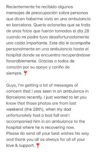La cipotona agregó que ella lo acompañó en la ambulancia hasta el hospital donde ya se recupera. Agradeció a la fanaticada el apoyo y el cariño.